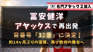 冨安健洋選手がオランダの名門アヤックスで背番号「32番」を選択。これは、アビスパ福岡時代のデビュー時と同じ“原点の番号”。アーセナル退団から5ヶ月、実戦から約14ヶ月ぶりの復帰を果たす。「32番」は再出発と決意の象徴。本記事では、番号の意味や日本代表「22番」との関係、ファンの反応、そして代表復帰の可能性を徹底解説。
